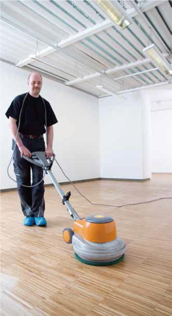 - 用擦地機加3M 紅色磨片或同類產品低速清潔(用強力通用清潔劑1:20 兌水稀釋后加入擦地機內),除去地板表面的保護蠟、 油脂、灰塵及其它污垢,用吸水機將污水吸干。